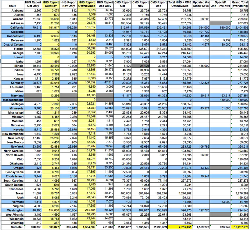 - Everything below except for the "updates since 12/28" and some (not all) of the Special/One-Time Transfers come directly from the official HHS and CMS reports. If their data (and especially their footnotes) are accurate and comprehensive, then everything else should be correct. If any key data from their reports is either missing or incorrect, then obviously the rest of my calculations would be off accordingly.