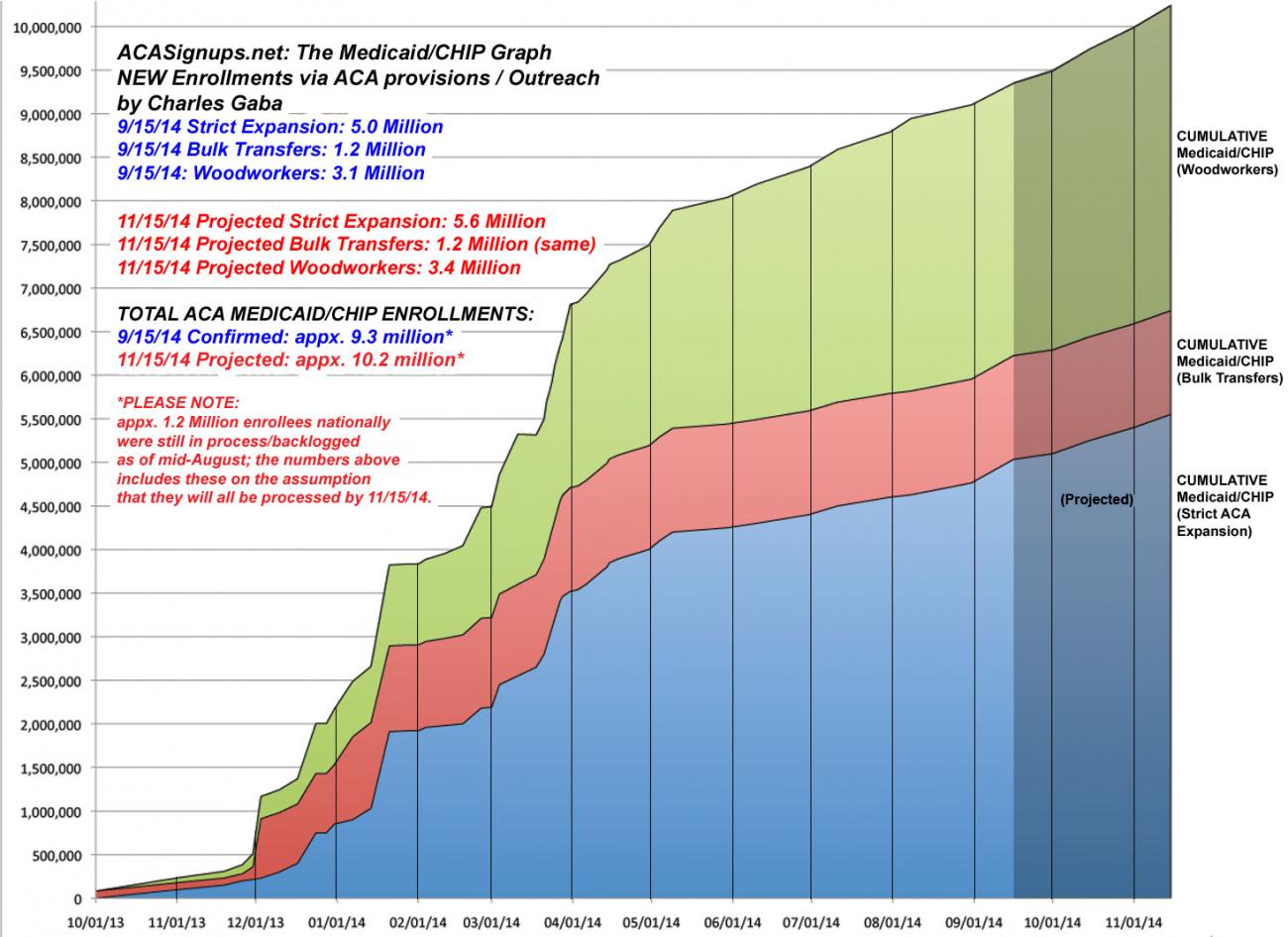 Also like the QHP graph, I've been emboldened enough to project the Medicaid/CHIP graph out through mid-November. Between the two graphs, I'm projecting that by the time 11/15/14 comes around, the Affordable Care Act will have enabled new healthcare coverage for appx. 28 million people: