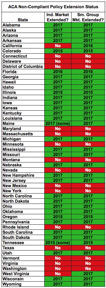 In the interest of simplicity, I'm not going into as much detail as she did; I'm just including the individual & state markets, and whether each state is allowing extensions through 2015, 2016 or 2017.