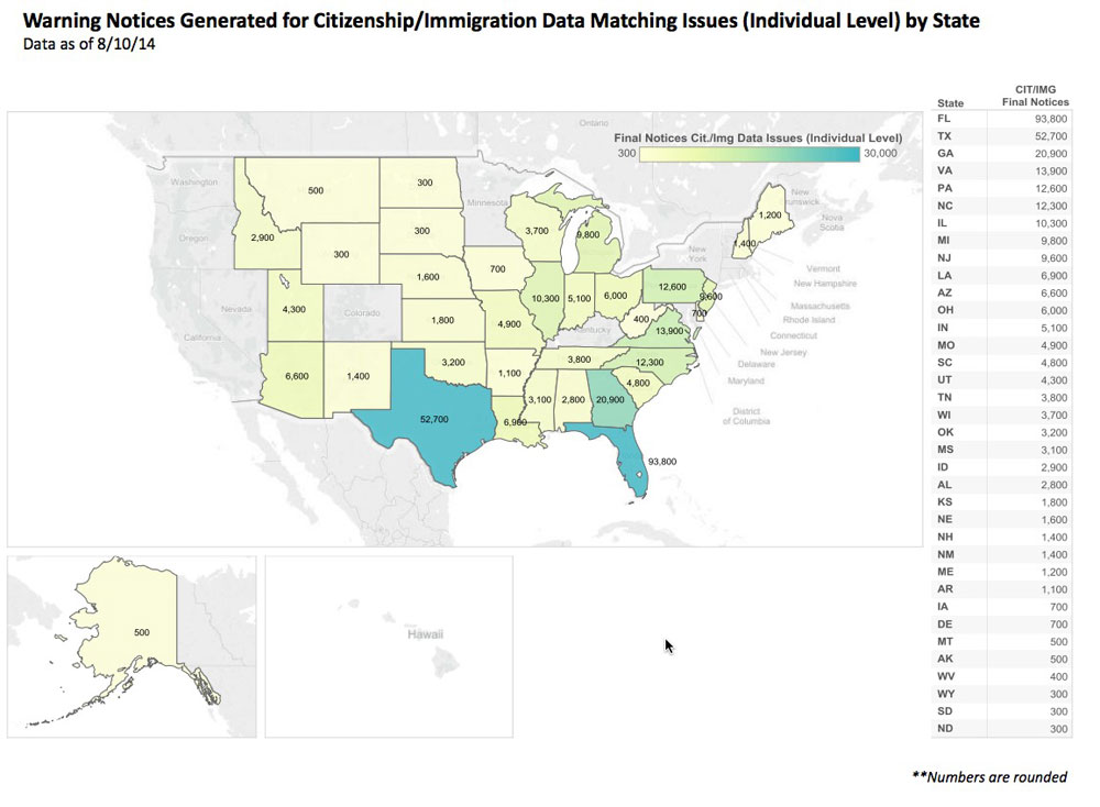 I assumed that if California only had to cancel 10K out of 148K, the odds are that there would be only another 10-20K cancelled for these reasons nationally, since the actual number of people sent final notices by HHS ended up being only 115K. The above "warning notice" link makes it sound like there were another 191,000 who had been sent an earlier warning, but assuming the same ratio, that should still only bring the total number cancelled for citizenship issues to perhaps 50,000 or so nationally.