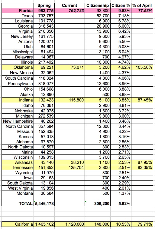 In short, if the immigration/citizenship data issue is a major factor after all, then the current enrollee number might be lower than 6.8 million...but that's still impossible to tell with the data at hand. The absolute worst-case theoretical scenario here would be if every single one of the 199K people shown in non-highlighted states above has been dropped, which is ludicrous--there's no reason why a higher percentage of immigrants in Texas or Georgia would be likely to have data discrepancies than in Florida.
