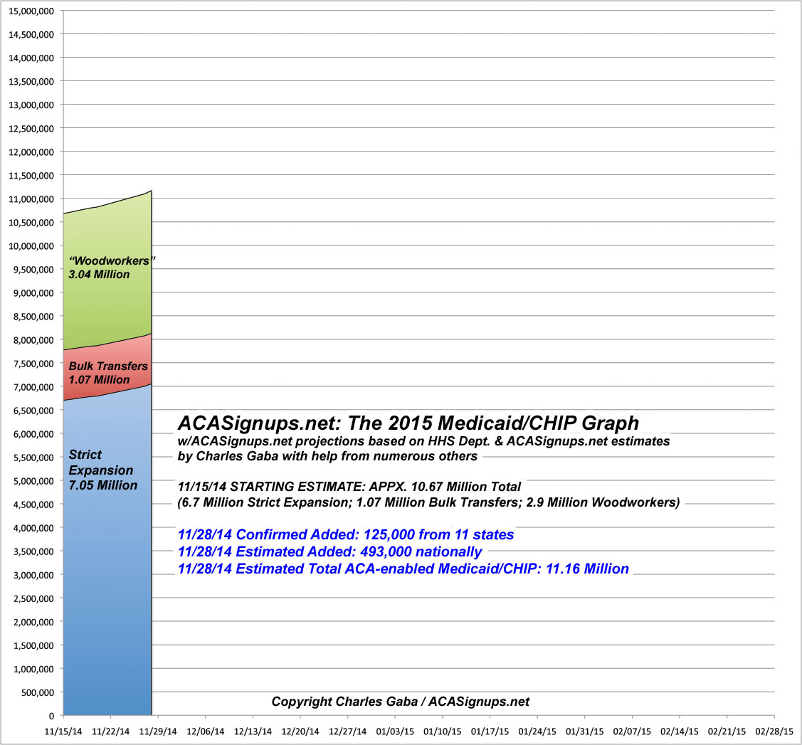 In addition, as I noted when the September CMS Medicaid/CHIP report came out, my own estimate seemed to be running around 4.5% too high compared to the official government figures (they had 9.1 million + 950K from prior to 2014 as of 9/30 (around 10.05 million); I had it down as around 10.5 million, or 450K higher.