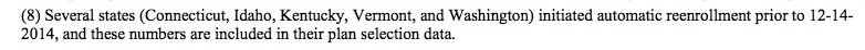 • Connecticut: OK, CT is indeed one of the states which has autorenewals included in the HHS report. Even so, there's an 8,400 discrepancy between HHS's 77,042 and Access Health CT's 85,466 (19,402 new + 66,064 renewals).