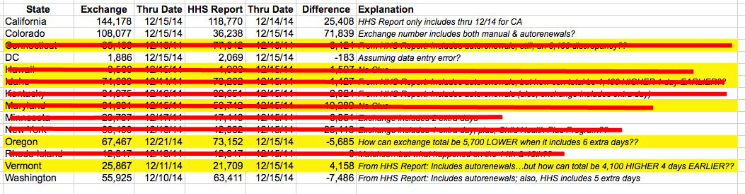It got to be so strange that I actually whipped up a little spreadsheet for all of the state-based exchanges (minus Massachusetts, which is a special case anyway; plus Oregon, which is running off of HC.gov this year but has a large discrepancy from the official State of Oregon Website which is reporting enrollments this year as well). The yellow lines are the states I'm most concerned about (the others all have either obvious explanations or are minor enough not to worry about). Afterwards I'll run through the problems with each one.