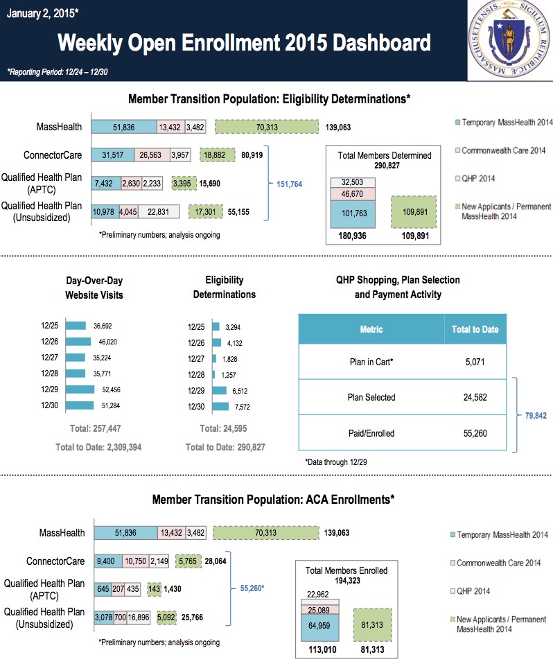 The Massachusetts exchange has released their weekly dashboard report, which includes actual QHP selections and payments, although that data only runs through 12/29.
