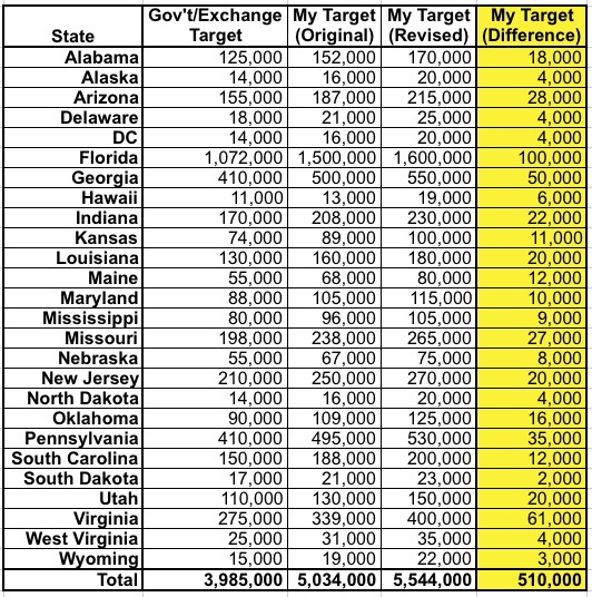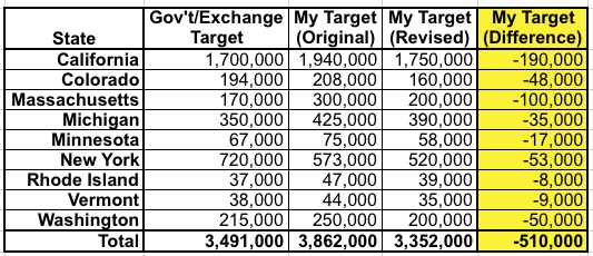 Assuming things play out fairly close to the above adjustments (and the remaining 16 states hit my original targets), the grand total should still come in at roughly 12.5 million overall.
