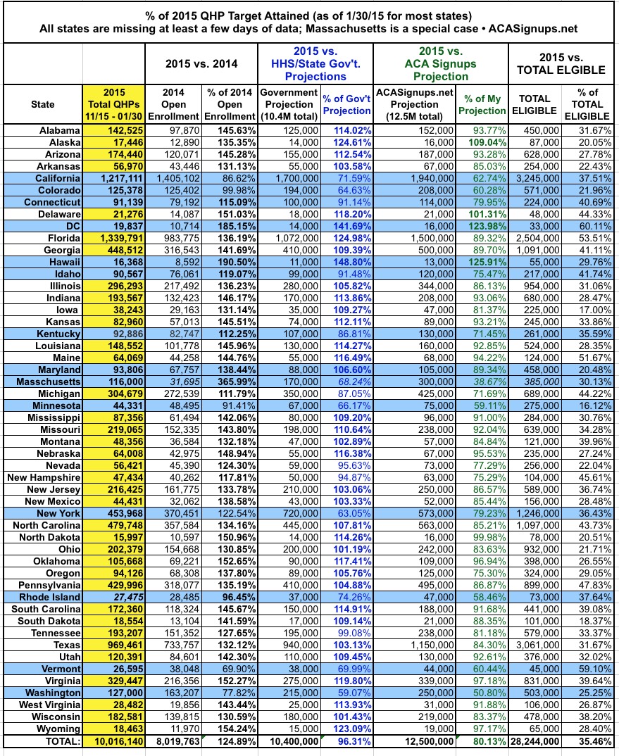 *Note: it looks like NY may be including about 58K "Child Health Plus" enrollees in this number; if so, the actual QHP total would be about 454.5K, still impressive...and would also reduce the total below to about 10.016 million..but still over the 10 million mark. Until I can confirm this, however, I'm leaving the full 513K in the spreadsheet.
