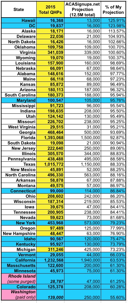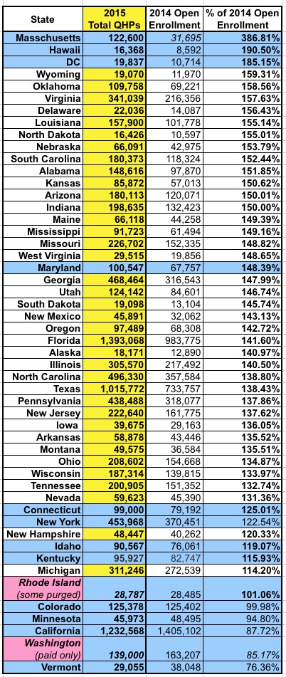 3) For Rhode Island and Washington, I'm using a different number than the other states; RI is the QHP selections, but after past-due non-paid ones have been purged from the total; in WA, they're only reporting the paid QHPs at all, so I don't know what the total selections are to begin with.