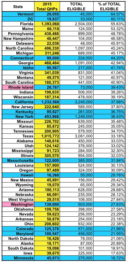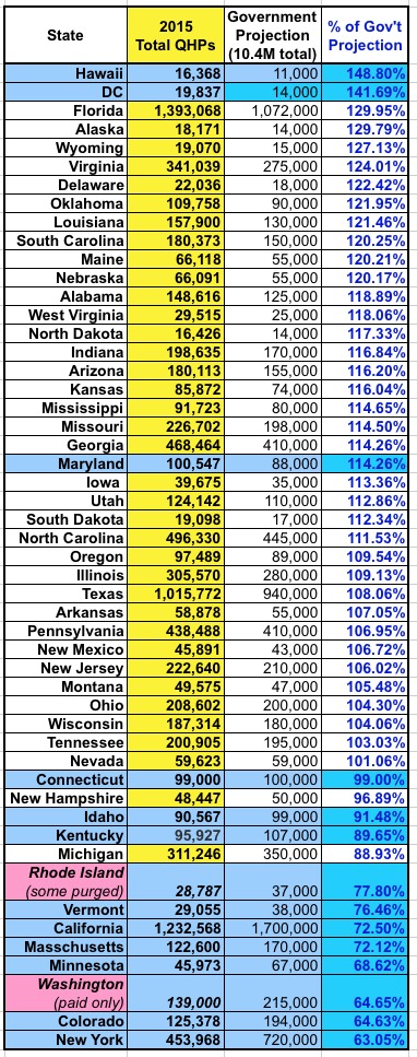 Not too different, excpet that Florida and New York have moved down and up respectively, as I've assigned both of them more reasonable targets. Washington State is bringing up the rear, partly due to their "paid enrollments only" policy...but even if they included total selections, I still doubt they'd be higher than 65%.