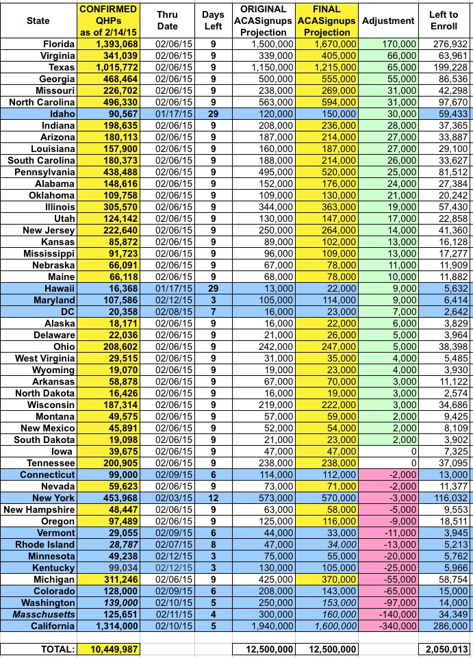 - FLORIDA: Holy smokes...as I noted in my most recent healthinsurance.org exclusive, Florida was already 41% ahead of their 2014 tally as of 8 days ago, and their enrollment outreach machine shows no sign of stopping. I've increased my final target for FL from 1.5M to 1.67M...a 70% increase over last year's tally.