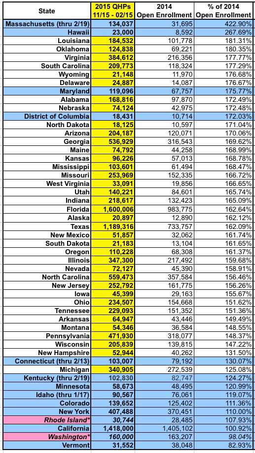 However, for sheer numbers, Florida is a jaw-dropper: Over 1.6 million enrollments...11% more than 2014 king California, even though CA has nearly double the population. And remember, with an extra week of potential "In Line by Midnight" additions, Florida could potentially break 1.7 million in the end.