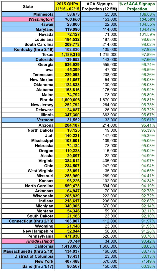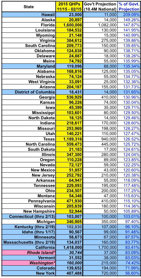 2015 QHP Enrollment Period vs. "Official" HHS Dept./State Exchange Projections: