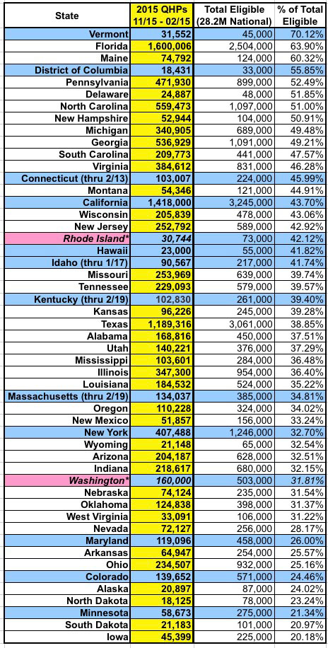 Note that 8 states have now enrolled at least 50% of their potential market, while 20 have enrolled at least 40%. Thirty-two states have enrolled at least 1/3.