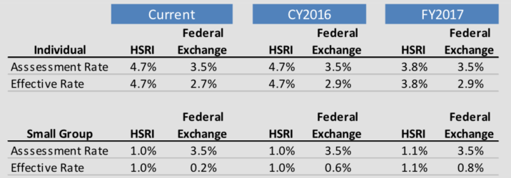 According to a chart in the article which compares the "official" and "effective" tax rates over 3 years depending on whether RI keeps their own exchange or makes the move to HC.gov, in 2015 the "effective" rate for RI at HC.gov would only be 2.7% vs. 3.5%: