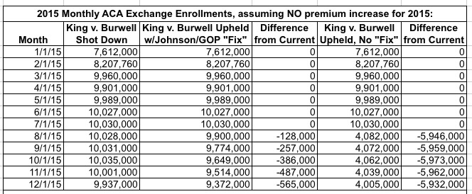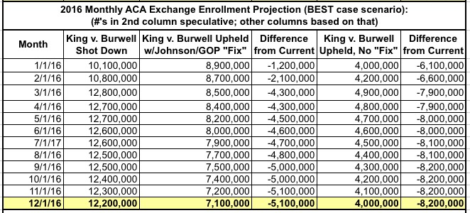 In 2016, under Johnson's plan, practically no one would be enrolling via the federal exchange, and with the individual mandate gone causing rates to spike (remember, the guaranteed issue rule would still be in place), hardly anyone would be enrolling via the state exchanges either. That would essentially lock things in at whoever was still enrolled at the end of 2015 only. Assuming 95% of them renewed for 2016 and normal attrition of perhaps 2% per month, you'd be down to around 7 million by the end of the year...some 5.1 million fewer than if the King case is shot down.
