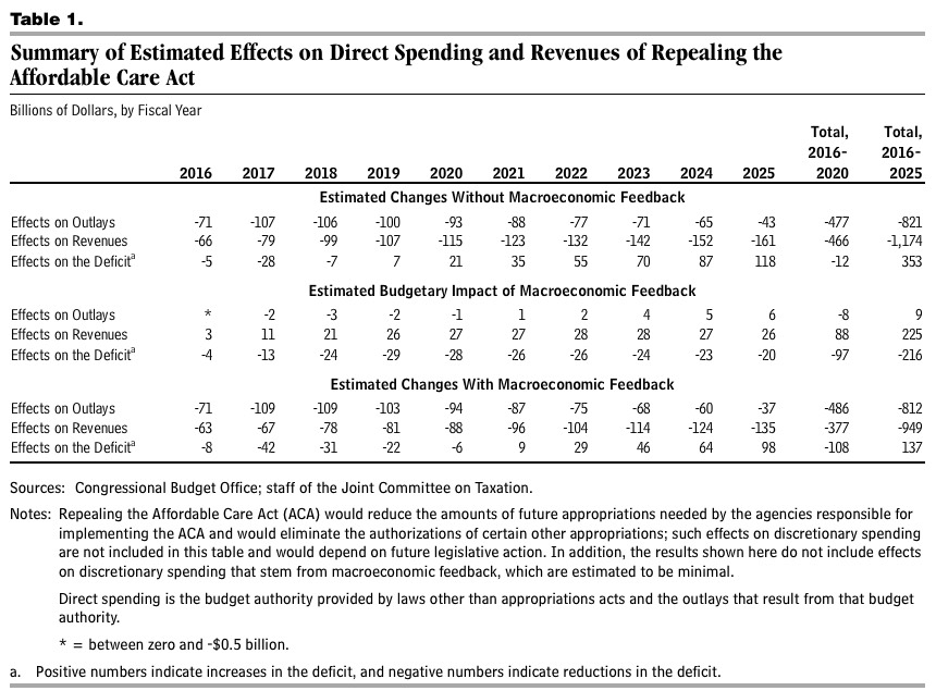 - Excluding the effects of macroeconomic feedback—as has been done for previous estimates related to the ACA (and most other CBO cost estimates)—CBO and JCT estimate that federal deficits would increase by $353 billion over the 2016–2025 period if the ACA was repealed.