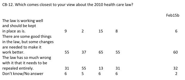 Nothing in the results are particularly surprising (GOP: Obamacare bad!; Dems: Obamacare good!), but they come to one rather silly conclusion in my opinion: