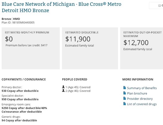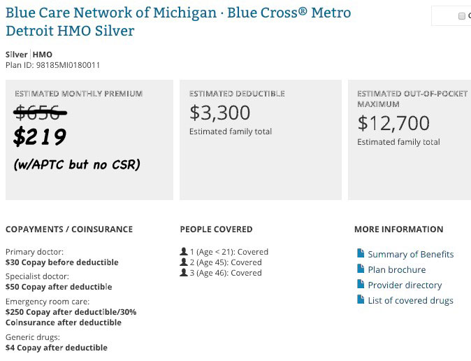 The difference this makes can be striking. Let's say that my wife, son and I happened to have a household income of $30,000/year here in Oakland County, Michigan. Our APTC subsidy would be $437/month, meaning that we could get a Bronze plan from Blue Cross Blue Shield of Michigan without having to pay a dime in premiums, which is awesome!