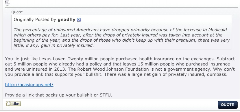 Anyway, while I certainly appreciate my work here being used to educate people about how well/poorly the Affordable Care Act is faring, and being used to debunk false claims, the level of discourse is...well, about what you'd expect.