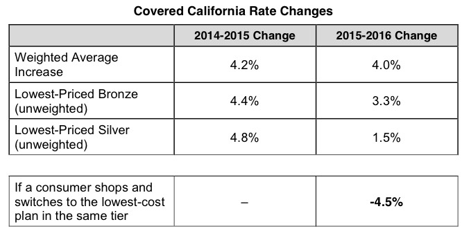 SACRAMENTO, Calif. — Covered California announced its rates for 2016 and unveiled which health insurance companies will be offering plans through the marketplace. The statewide weighted average increase will be 4 percent, which is lower than last year’s increase of 4.2 percent and represents a dramatic change from the trends that individuals faced in the years before the Patient Protection and Affordable Care Act.