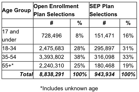 Hmmm...children and young adults (under 35) went from 36% of the total during open enrollment to 47% of the total, with the biggest jump being a doubling of the percent of children. This makes sense assuming that a large chunk of the 152K who fall under "Other" were babies being born and added to an existing policy.