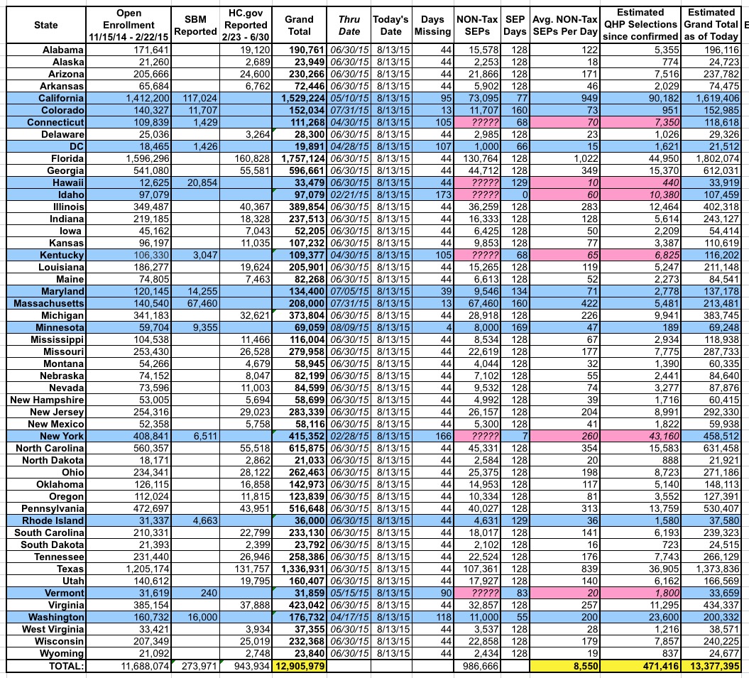 As I noted in my update to the previous post, I originally inadvertently double-counted the Tax Season SEP enrollees, and had to subtract 147,000 of them (the earlier-announced number) from the grand total. On the one hand, this brings things down to 12.9 million (12,909,955). On the other hand, this was still as of June 30, so the grand total as of today (August 13) almost certainly is at least 13.1 million after all.