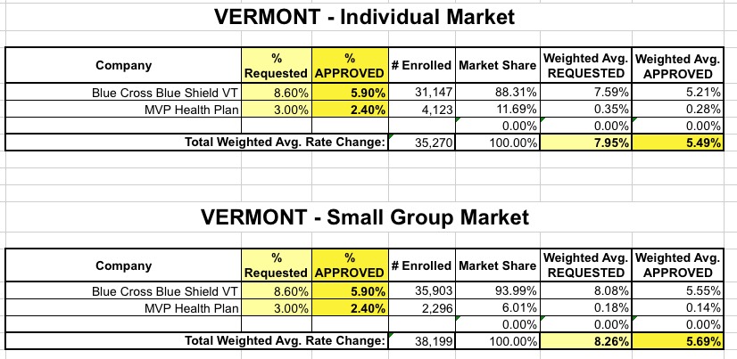 In addition, as far as I can tell, in Vermont, both the individual and small group markets are considered part of the same rate pool, although the market share differences between the two still resulted in slightly different weighted averages: 7.8% for the individual market, 8.1% for the small group market. These were slightly revised to 8.0% and 8.3% just prior to the review/approval process.