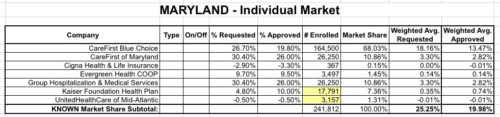 Today, the Maryland Dept. of Insurance has released the final, approved rate changes, and while 5 of the 8 companies on the individual exchange saw reductions in their rate change (2 others were approved as is, and one, Kaiser Health Plan was actually increased from 4.8% to 10%), it's still difficult to lock down a fully weighted average due to some crucial enrollment data missing.