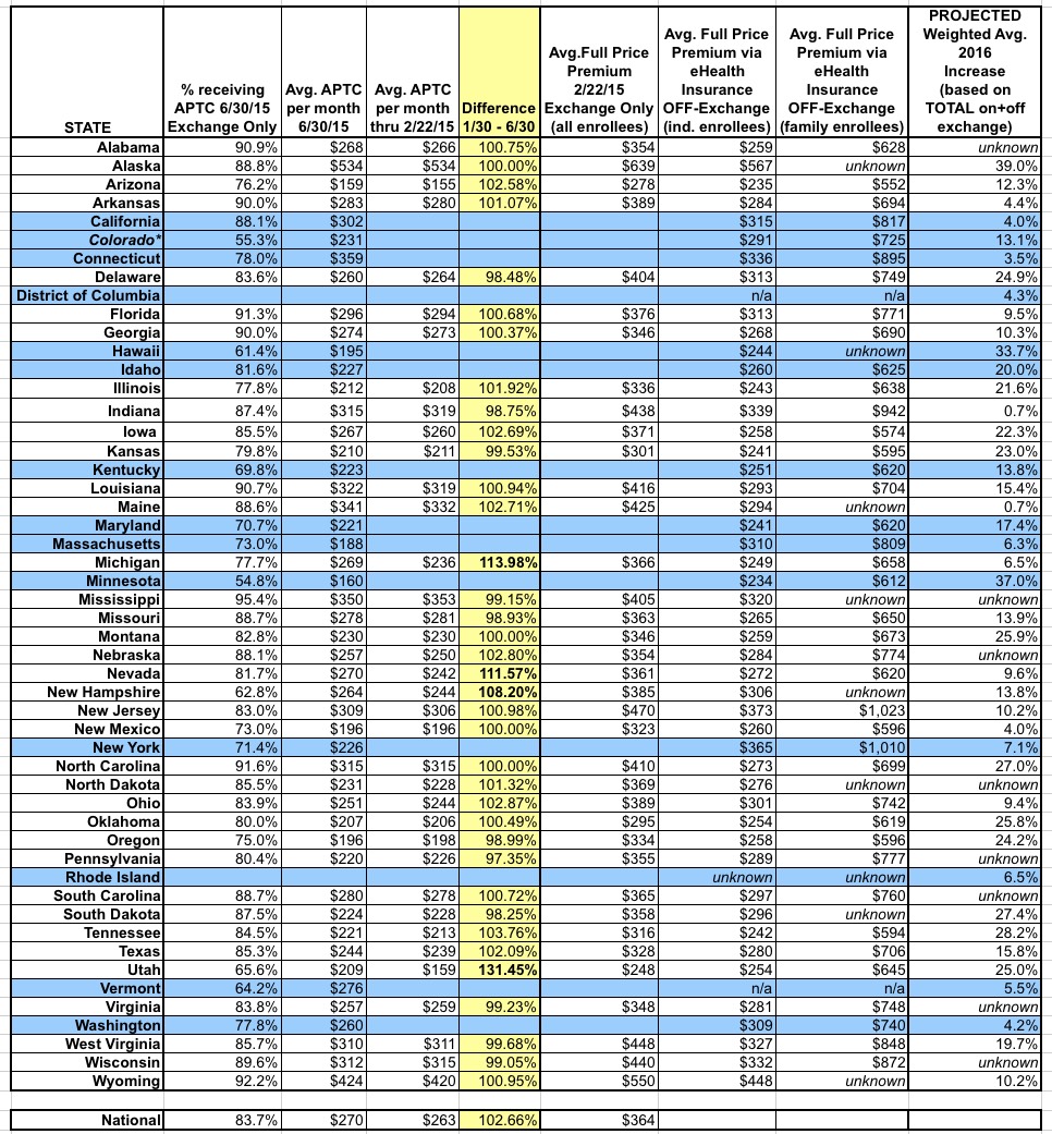 In order to address the last point, there's the CMS division's June 30, 2015 effectuated enrollment snapshot. This does include all 50 states (+DC), and it's much more up to date, of course...but it doesn't list the actual full-price premiums, just the percent receiving APTC (federal tax credits) in each state, and the dollar amount of APTC received on average. Furthermore, that average is based only on those receiving APTC assistance at all. This skews the numbers further for the following reason: