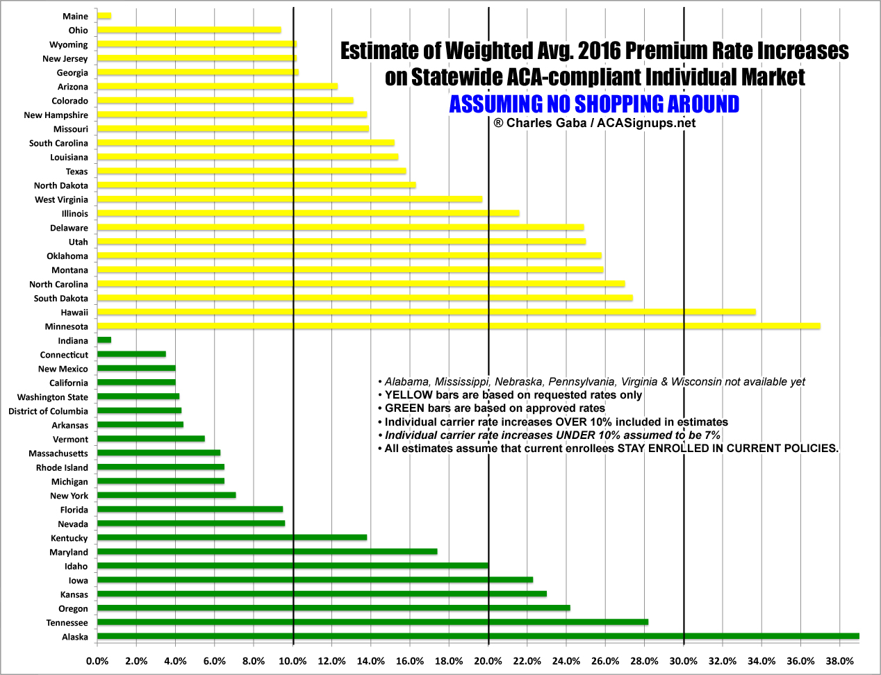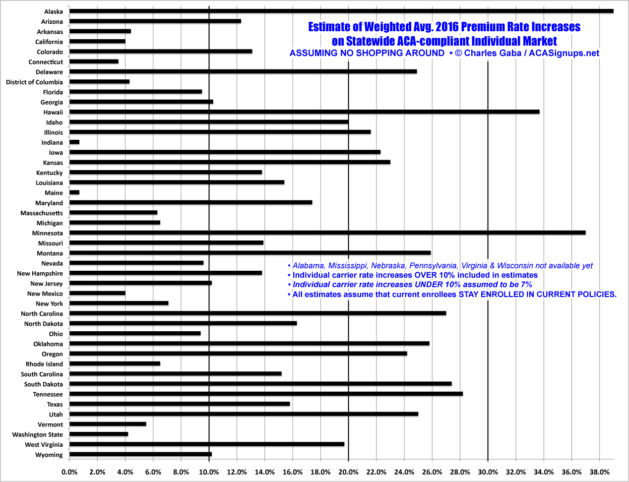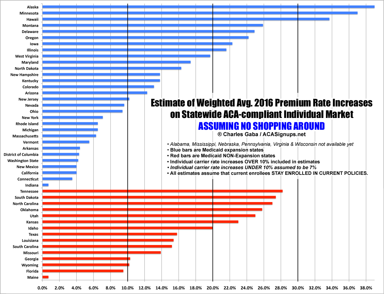 Hmmm...at first glance, the opposite appears to be the case here: The 3 highest average hikes are all in Medicaid expansion states (Alaska, Minnesota & Hawaii). However, the lowest average hikes are also found in the expansion states (aside from Maine, the non-expansion states are all 9% or higher). In addition, Alaska is an outlier since they just expanded Medicaid (and even that was barely forced through by the governor, is still facing a lawsuit from the state legislature and hasn't actually been implemented as of this writing anyway). I should note that 5 of the 6 missing states have not expanded Medicaid; Pennsylvania is the sole exception. My conclusion? There's no clear rate hike pattern based on whether the state expanded Medicaid or not.
