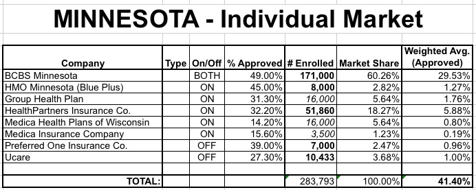 When I crunched the numbers for Minnesota's requested rate hikes, the results were pretty scary-looking; based on partial data, I estimated that the weighted average was something like a 37% overall requested increase: