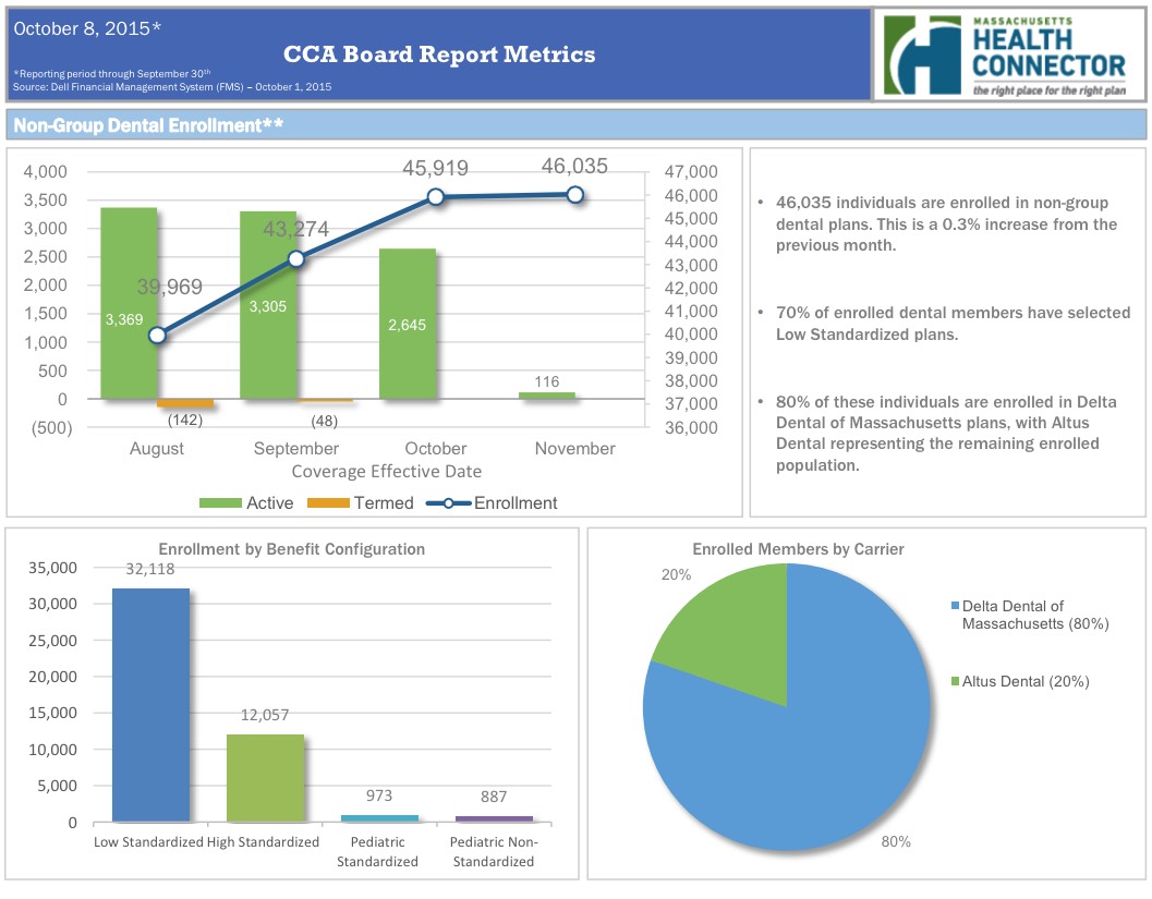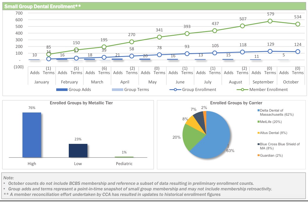 But wait, there's more! Look below and you'll see a whole mess of pie charts, bar charts and line charts, breaking out everything from Metal Level selections and Market Share by Provider to SHOP enrollments (5,562 lives covered as of October 1st) and even Dental Plans!