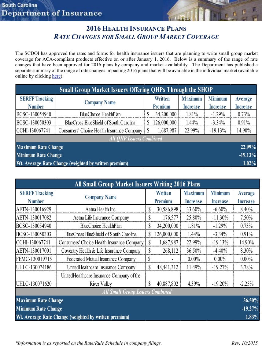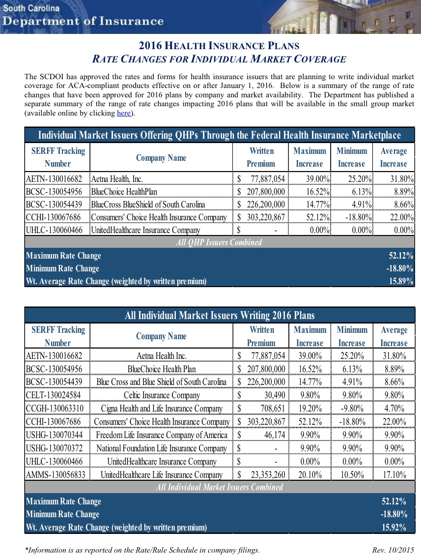 Well, the South Carolina Dept. of Insurance just released their approved 2016 rates, and they ended up pretty much splitting the difference.