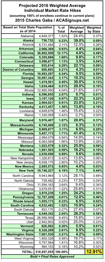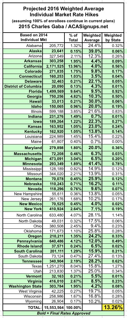 As a reminder: What I've done here is to take the overall weighted average 2016 rate increases for the ACA-compliant individual health insurance market for each state (requested in some states, approved in others) and plug those into a spreadsheet. Then, I've further weighted each state's average increase by that state's percentage of the national total, using 3 different criteria: Total Individual Market (as of 2014); ACA Exchange Enrollment Size (as of March 2015); and Total State Population Size (as of 2014). Again, the bold-faced/green states are ones where the 2016 rates have been approved; the rest are still requested only and could change dramatically in some cases.