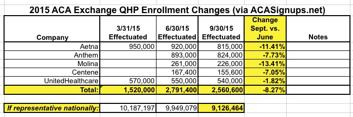 - 4 major insurance company financial reports suggest that September 30th effectuated enrollment was down to around 9.1 million (down 900K from June 30).