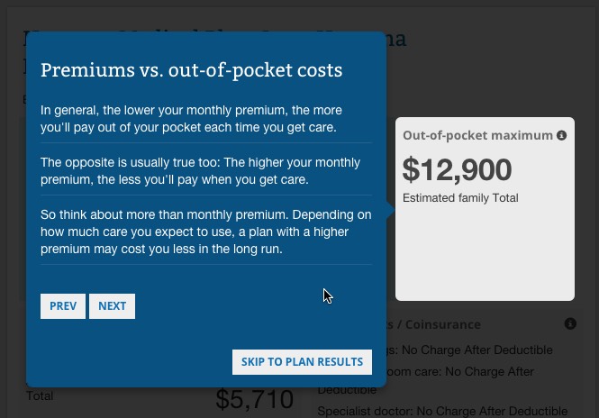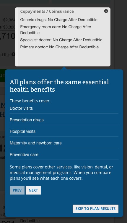 ...where they've added 4 new "Help Guides"...screen overlays to explain what the hell all of this stuff means (Copayments, Deductibles, Metal Levels and Out of Pocket vs. Premiums, as well as the Plan Filtering tool on the left sidebar):