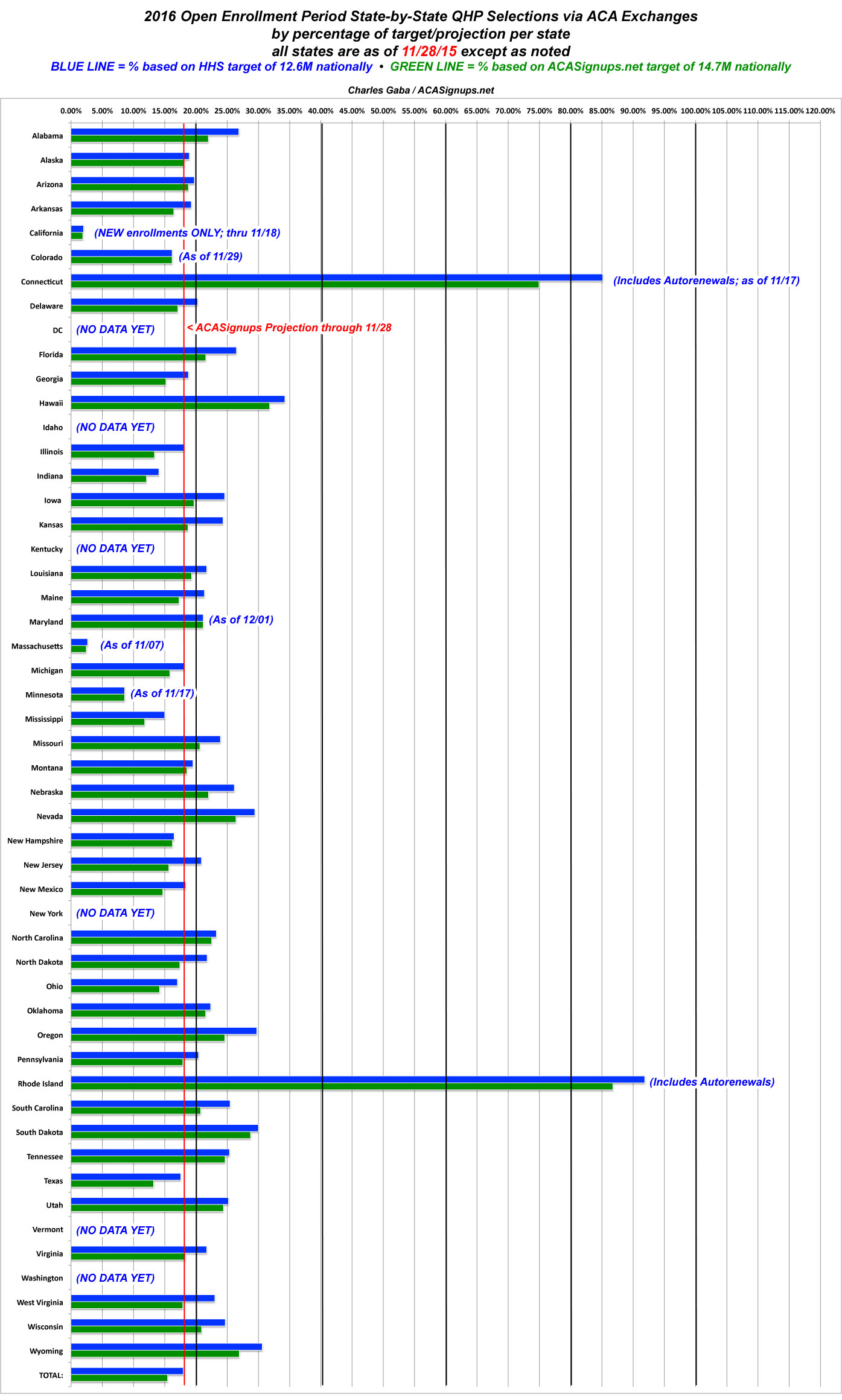 With all those caveats out of the way, here's where things stand. Just like last year, the BLUE LINES represent the percentage of QHP selections each state had achieved as of 11/28 compared to my best guess at their reasonable proportion of the 12.6 million people the HHS Dept. expects to select plans nationally. In some cases (California, Colorado, Connecticut, Idaho, Maryland, Minnesota and Vermont), I've used the official target number for that state, according to the exchange itself. For other states, I took a proportionate number based on the HHS Dept's 12.6 million total.