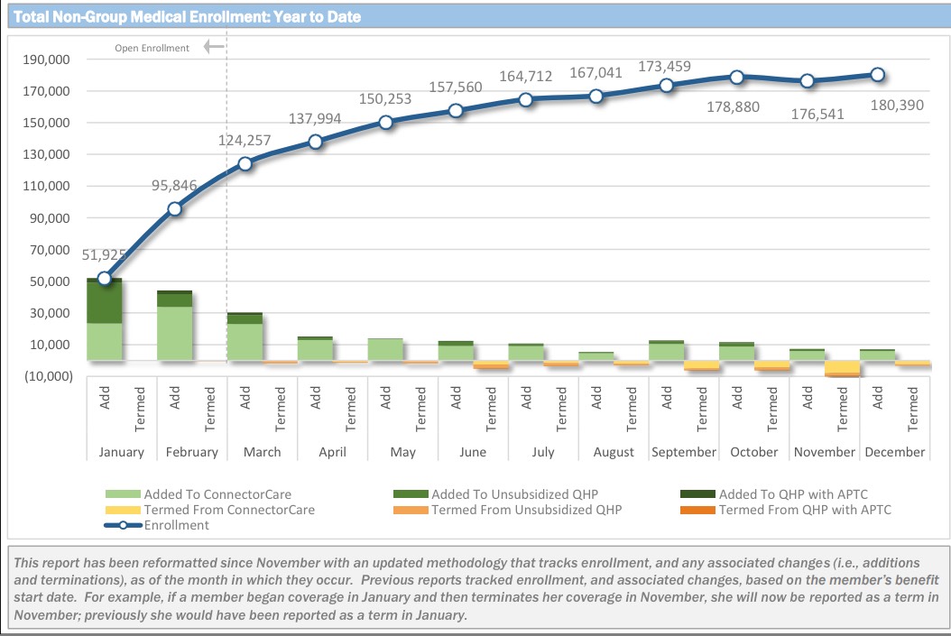 So, how the heck did they manage to renew 164,000 people when only 140,000 (or even 144,000) even selected plans for 2015 in the first place? SImple: I forgot that unlike other states, Massachusetts allows year-round enrollment in their special "ConnectorCare" exchange policies. These policies for lower-income residents, which include additional financial assistance from the state instead of the federal government, still qualify as QHPs as far as the HHS Dept. is concerned and are therefore counted towards the total. And according to the MA exchange monthly reports, this has caused the cumulative effectuated numbers to continue to climb steadily almost every month since Open Enrollment ended in February...to the point that as of the end of November there were 180,390 people enrolled in active, effectuated QHPs: