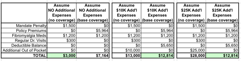 - IF she has no additional healthcare needs, without coverage, her cost will be $1,500, plus her fibromyalgia drugs at full price (I haven't a clue what it costs her...let's say $100/month?), plus, say, $300 for 3 $100 "regular" doctor's appointments = $3,000 total for the year.
