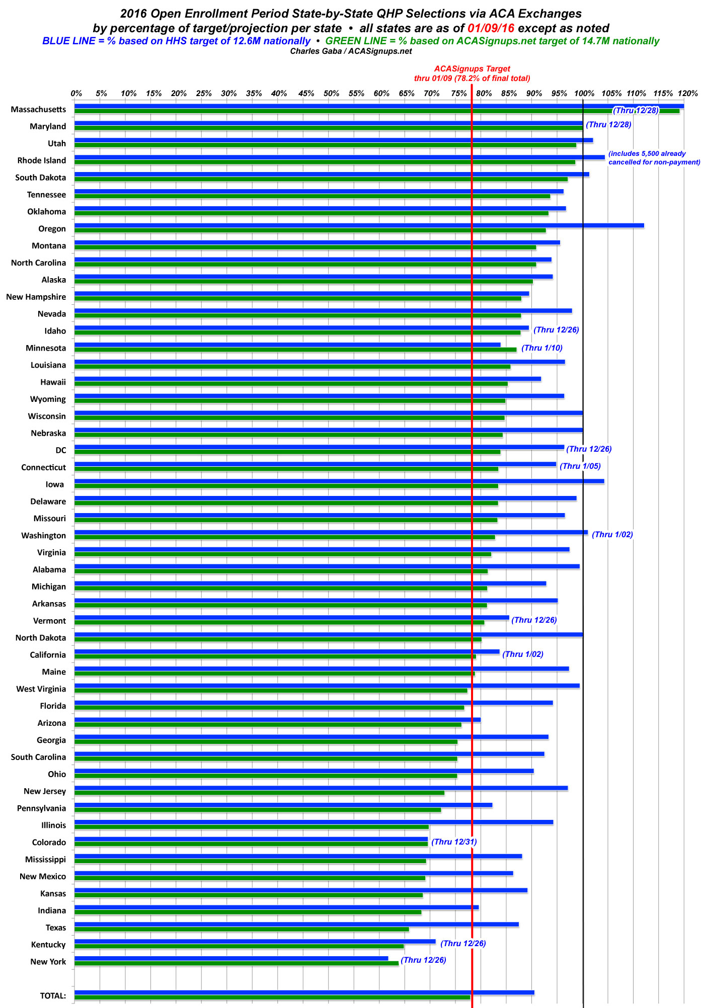 - The BLUE LINES represent the percentage of QHP selections each state had achieved as of January 9th for most states compared to my best guess at their reasonable proportion of the 12.6 million people the HHS Dept. expects to select plans nationally. In some cases (California, Colorado, Connecticut, Idaho, Maryland, Minnesota and Vermont), I've used the official target number for that state, according to the exchange itself. For other states, I took a proportionate number based on the HHS Dept's 12.6 million total.