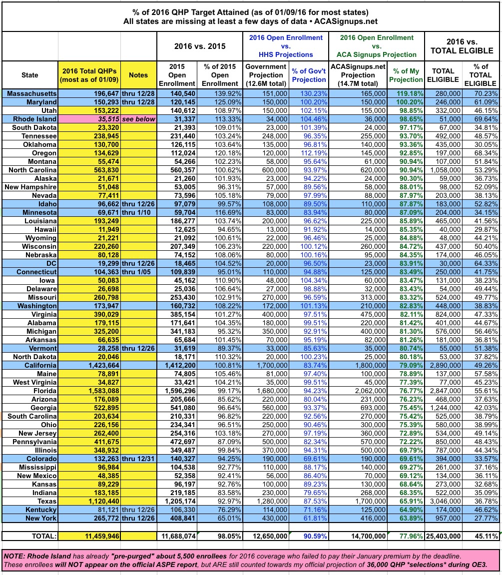 Note that whle the enrollment numbers for most states below are current through January 9nd, most of the state-based exchanges are either slightly more current or up to two weeks behind.