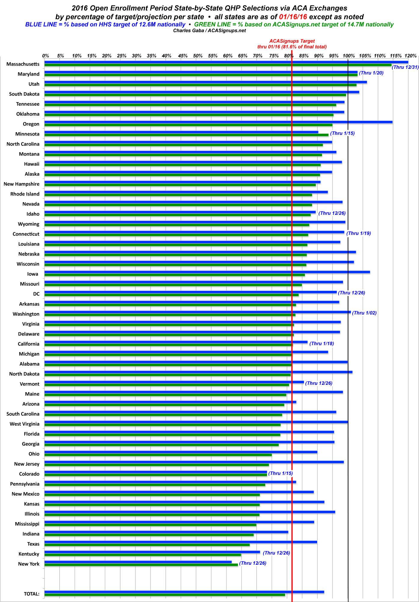 - The BLUE LINES represent the percentage of QHP selections each state had achieved as of January 16th for most states compared to my best guess at their reasonable proportion of the 12.6 million people the HHS Dept. expects to select plans nationally. In some cases (California, Colorado, Connecticut, Idaho, Maryland, Minnesota and Vermont), I've used the official target number for that state, according to the exchange itself. For other states, I took a proportionate number based on the HHS Dept's 12.6 million total.