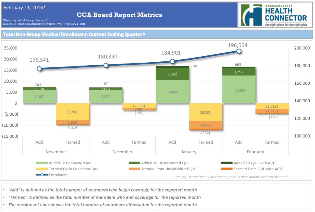 The reason MA managed to rack up another 4,800 people during the first 8 days of the off-season is mainly because ConnectorCare enrollment in Massachusetts is year-round (just as Medicaid enrollment is everywhere else).However, those extra 4,800 people's policies will kick off on March 1st anyway just as the ones signed up for from 1/16 - 1/31 will, so they still count. In addition, Massachusetts is the only state which only reports QHPs after the first premiums have been paid for, which means that they'll have at least 201,000 effectuated enrollees as of March 1st.