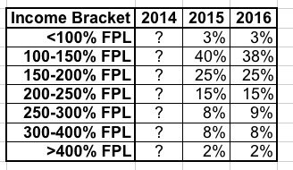 - What about income levels? We know that around 83% of enrollees qualify for APTC this year, but let's look at the income brackets over all three years: