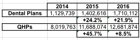 OK, this is kind of interesting. Enrollment in qualified health plans surged by 46% in 2015 followed by a huge slowdown in growth this year (only 8.5%), dental plan enrollment was more steady: Up 24% last year, and another 22% this year. This suggests that the standalone dental plans are being looked at more closely as time goes on. On the other hand, some QHPs include dental coverage anyway, so that's an unknown factor as well.
