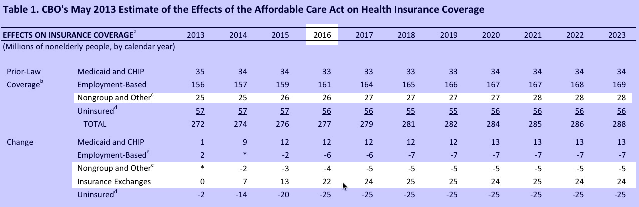 As you can see, in 2013 the CBO assumed that the total individual market would have increased to 26 44 million by now (22 million on exchange, around 9 million off exchange, 3 million via the Indian Health Service, 9 million non-senior Medicare and 1 million or so student health plans)...but this was partly based on the assumption that 6 million people would move off of their employer-sponsored plans over to the indy market. They figured that about 22 million people would be enrolled through the exchanges.