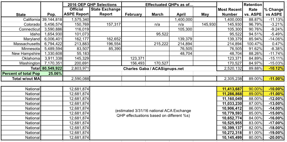That means instead of estimating QHP effectuations to have dropped to 11 million, I'm not estimating them at between 11.2 - 11.4 million, centering around the 11.3 million mark...which would actually be around what I was expecting it to have hit by 3/31/16 in the first place. Of course, this could still be off significantly one way or the other; the 10 states I have recent effectuation data for only make up 25% of the national population: