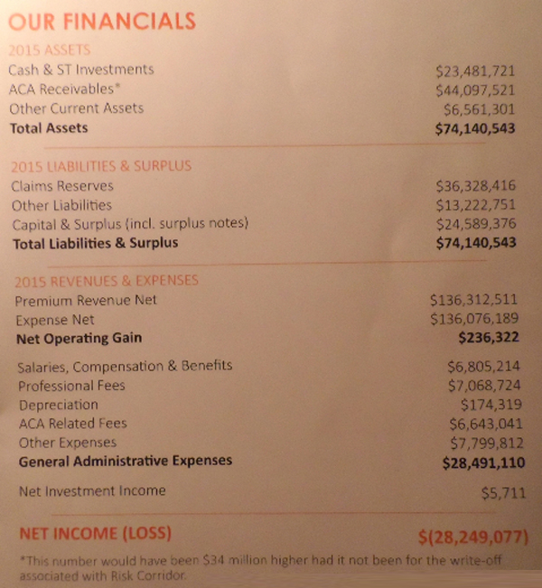 • I was also provided with an image of their overall financials for 2015 (see below). They didn't have much to say about this year since it's only May but seemed comfortable with how things are proceeding so far, and said their MLR (medical loss ratio) is "dropping" although from what to what I have no idea.