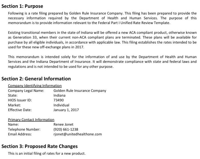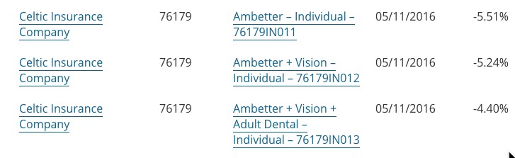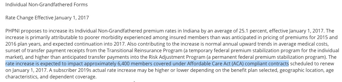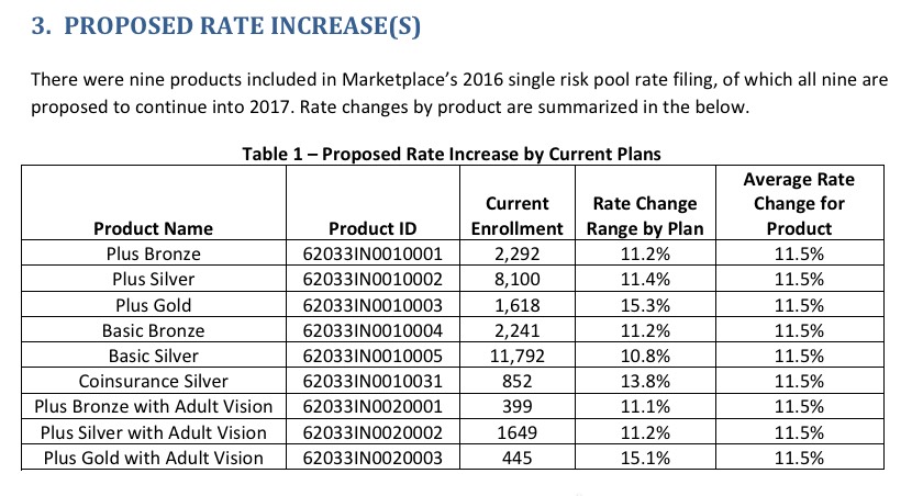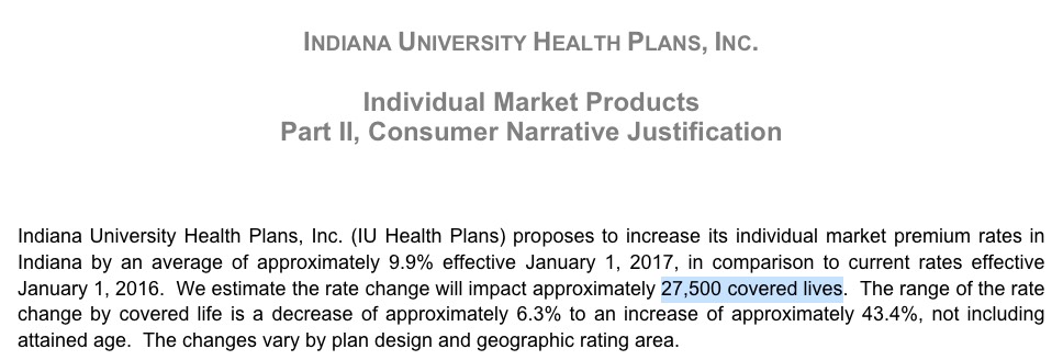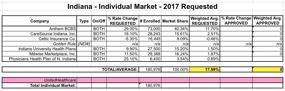 The good news is that I was able to track down the average rate change for all 6 carriers offering individual plans in Indiana (UnitedHealthcare is dropping out of the market, and I'm not sure what's going on with Aetna and Coordinated Care Corporation, both of which do have listings in Indiana's SERFF database for 2017...but neither of which has any actual filings listed. I presume these are placeholders for them to potentially enter the state market, which would be a good thing (and which Aetna has already indicated they might be doing next year). In addition, Golden Rule says that they'll be offering ACA-compliant policies starting next year as well (mainly for their current "transitional" enrollees).