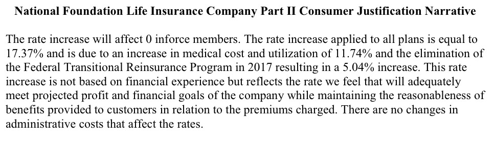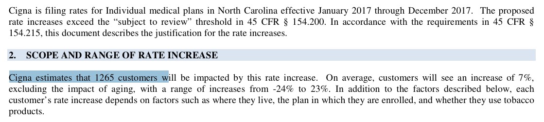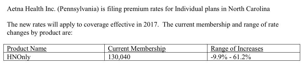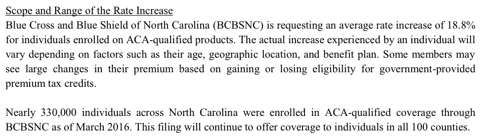 That leaves Blue Cross Blue Shield of NC and Aetna. BCBS's filing is pretty straightforward: 330K enrollees, 18.8% hike requested. Unfortunately, I can't seem to find Aetna's rate filing at all...but according to two separate news articles, they're requesting a 24.5% rate hike, and one of the articles lists their enrollment number as 130,000 people.